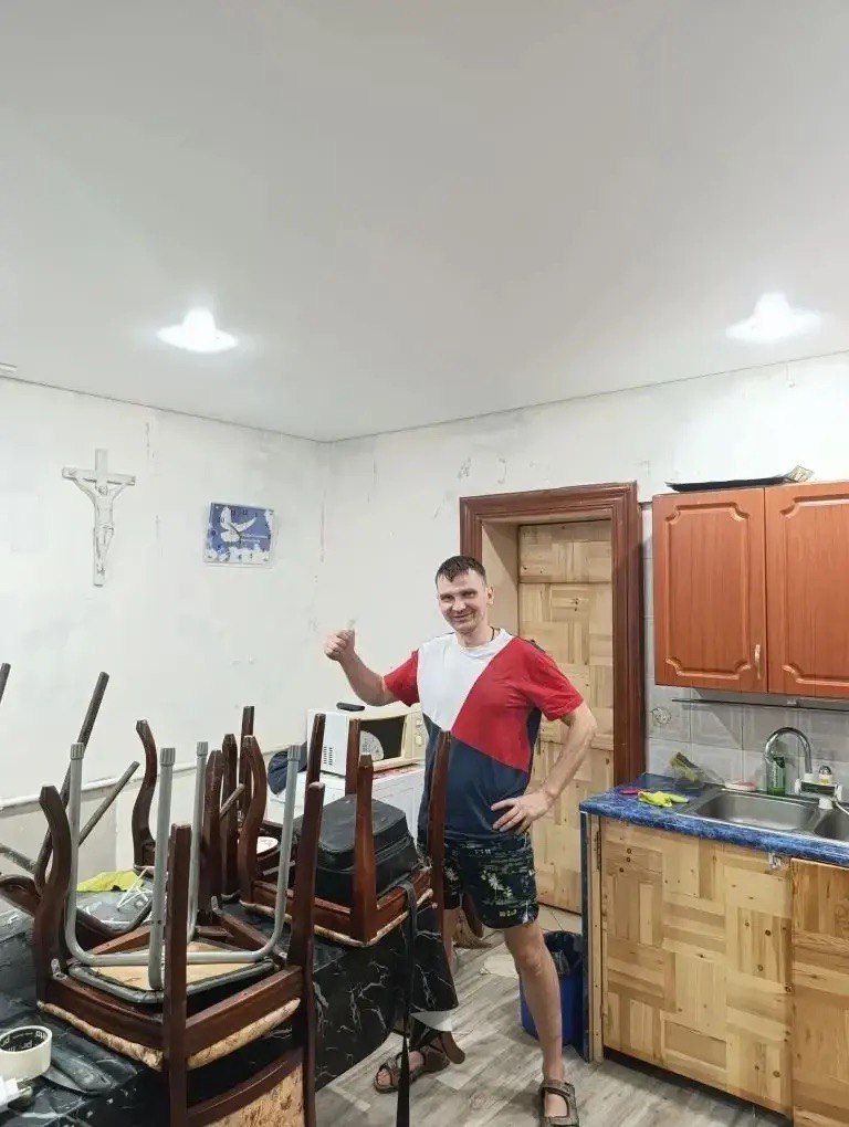 Мастер Андрей в очередной раз на благотворительной основе сделал натяжной потолок на кухне в нашем центре.